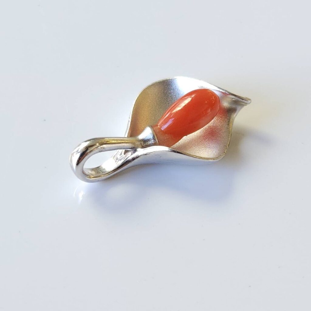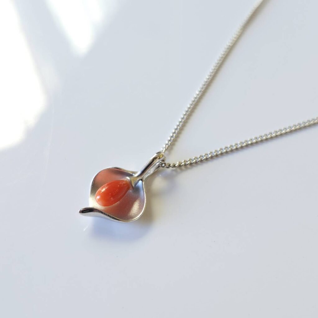 珊瑚の綺麗な赤をシルバーの金具が更に美しく引き立てているペンダントです。