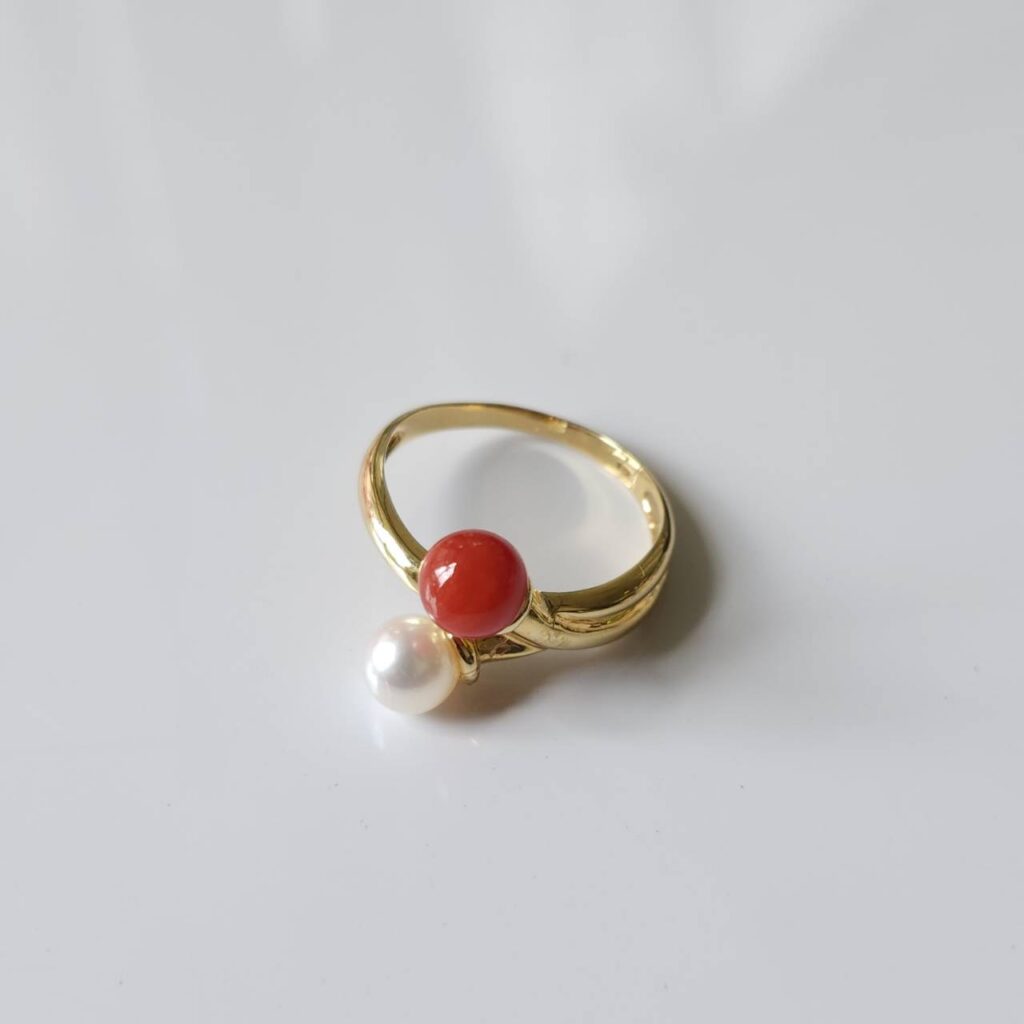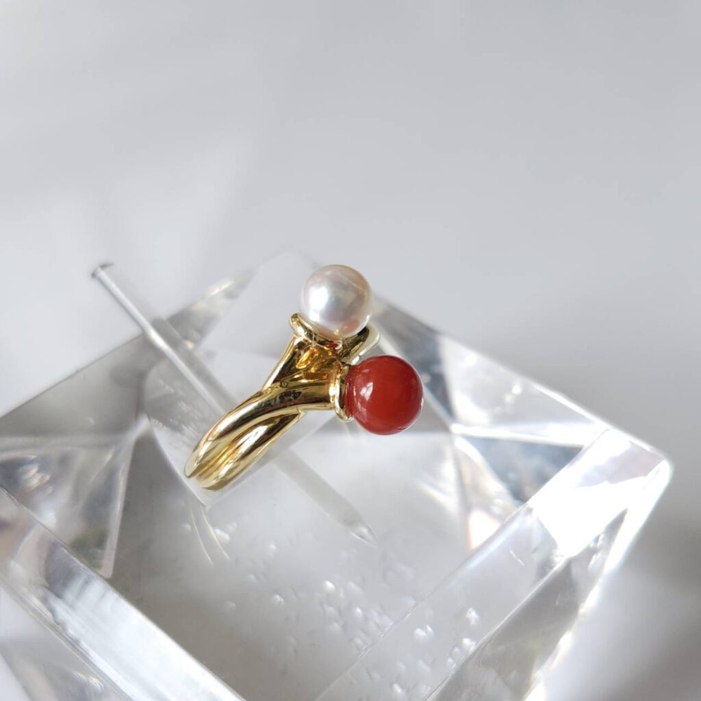 存在感と光沢のある赤珊瑚とパールの上品な輝きが