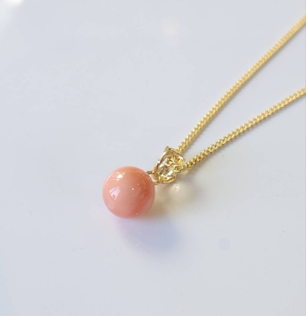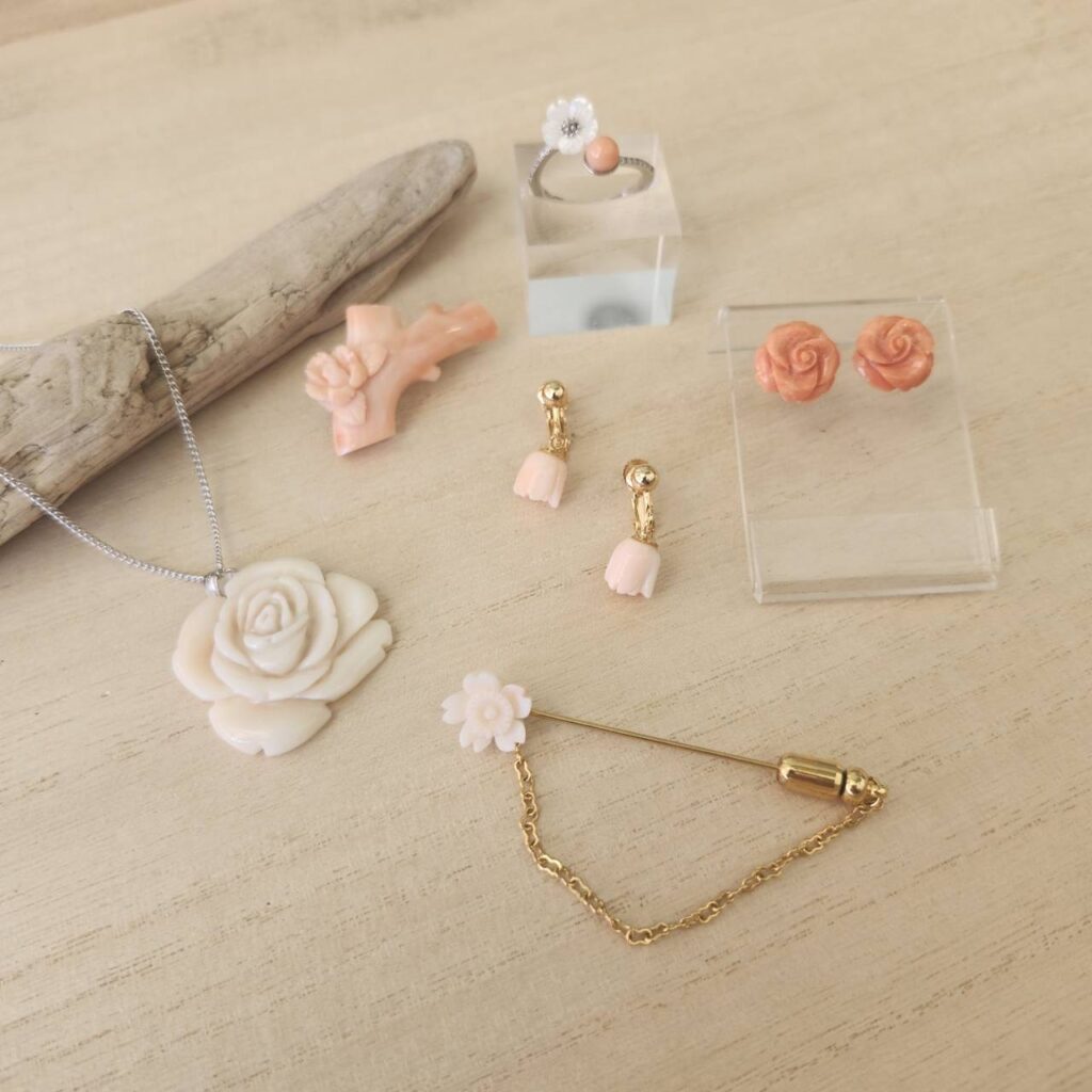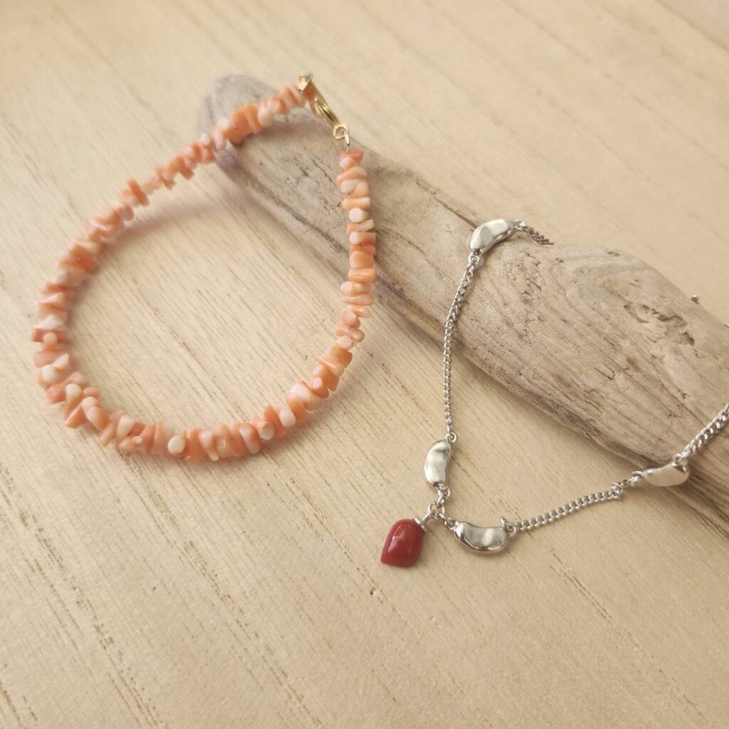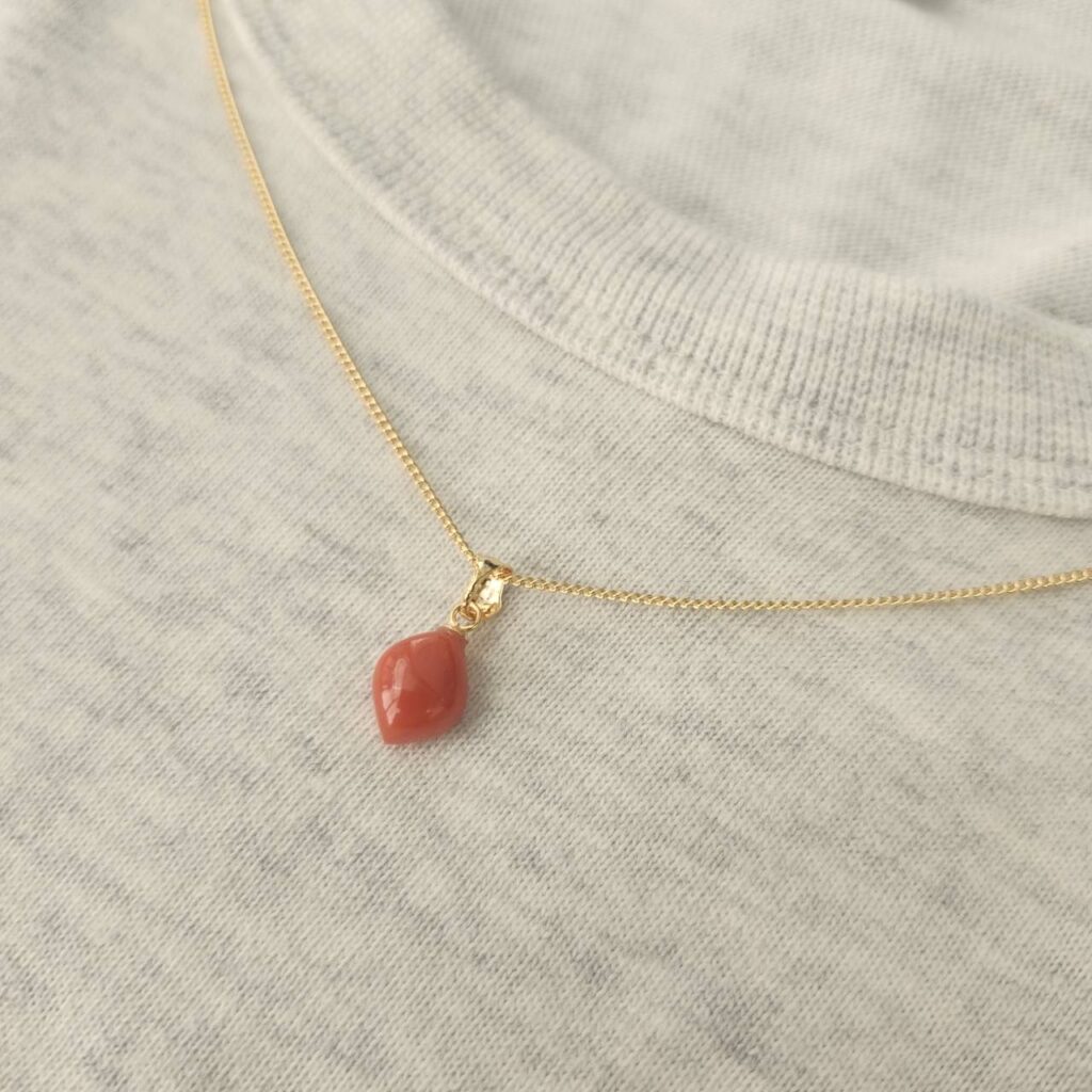 シンプルなTシャツやニット・ブラウスに天然の珊瑚のやさしい色合いをのせると